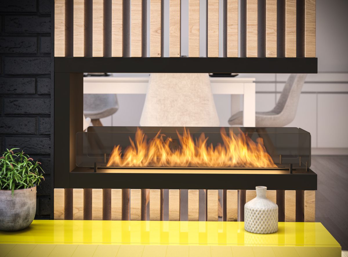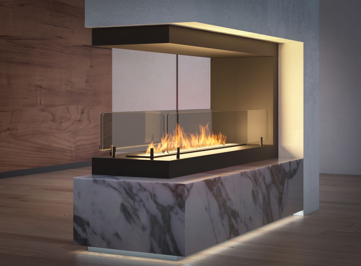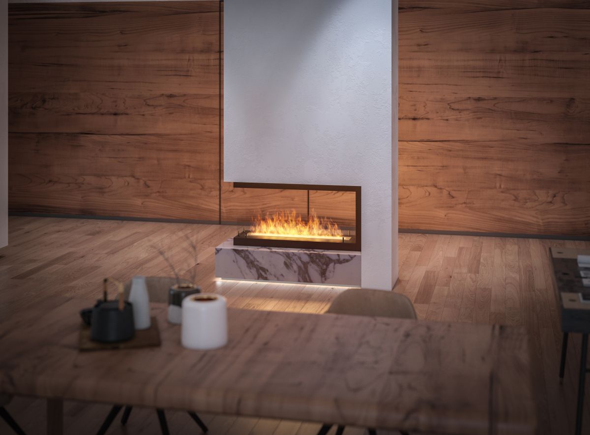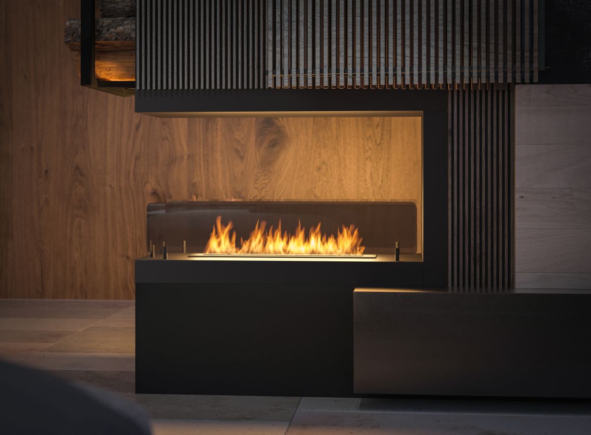 Designed to be embedded in a partition or wall end. A modern interior element that creates a personal interior and whose live fire is visible from three sides!