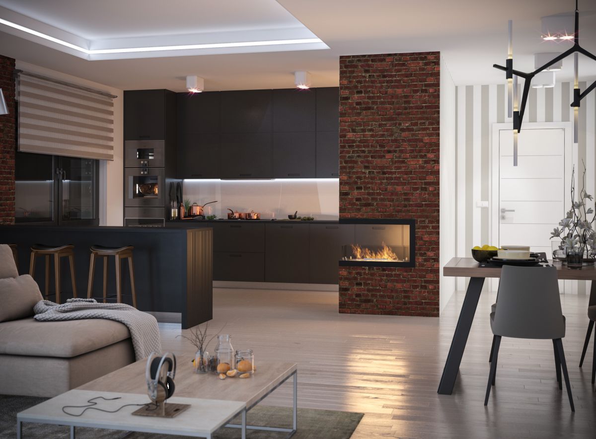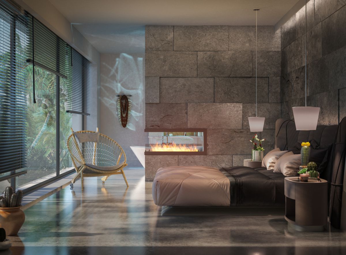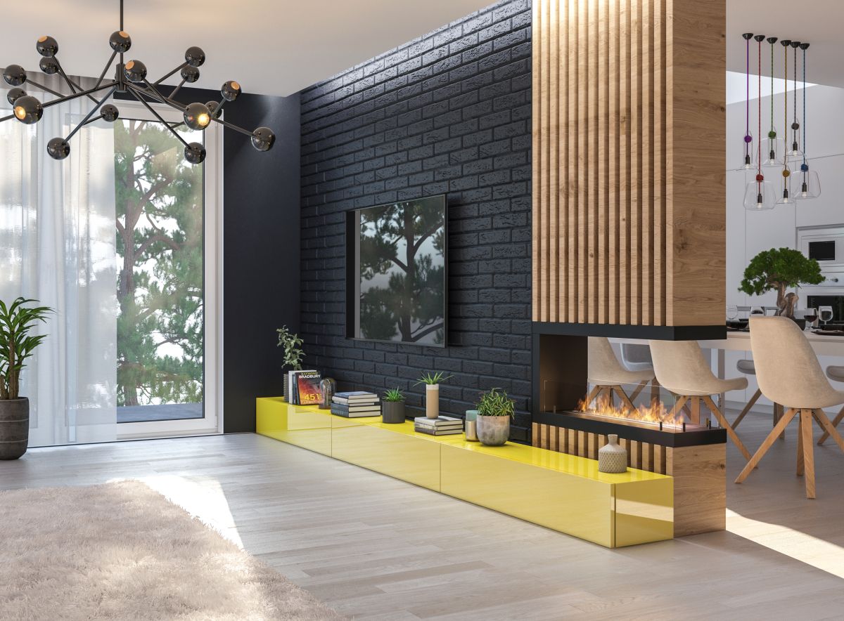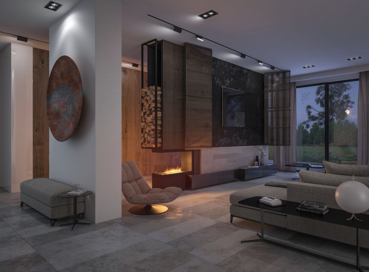 Designed to be embedded in a partition or wall end. A modern interior element that creates a personal interior and whose live fire is visible from three sides!