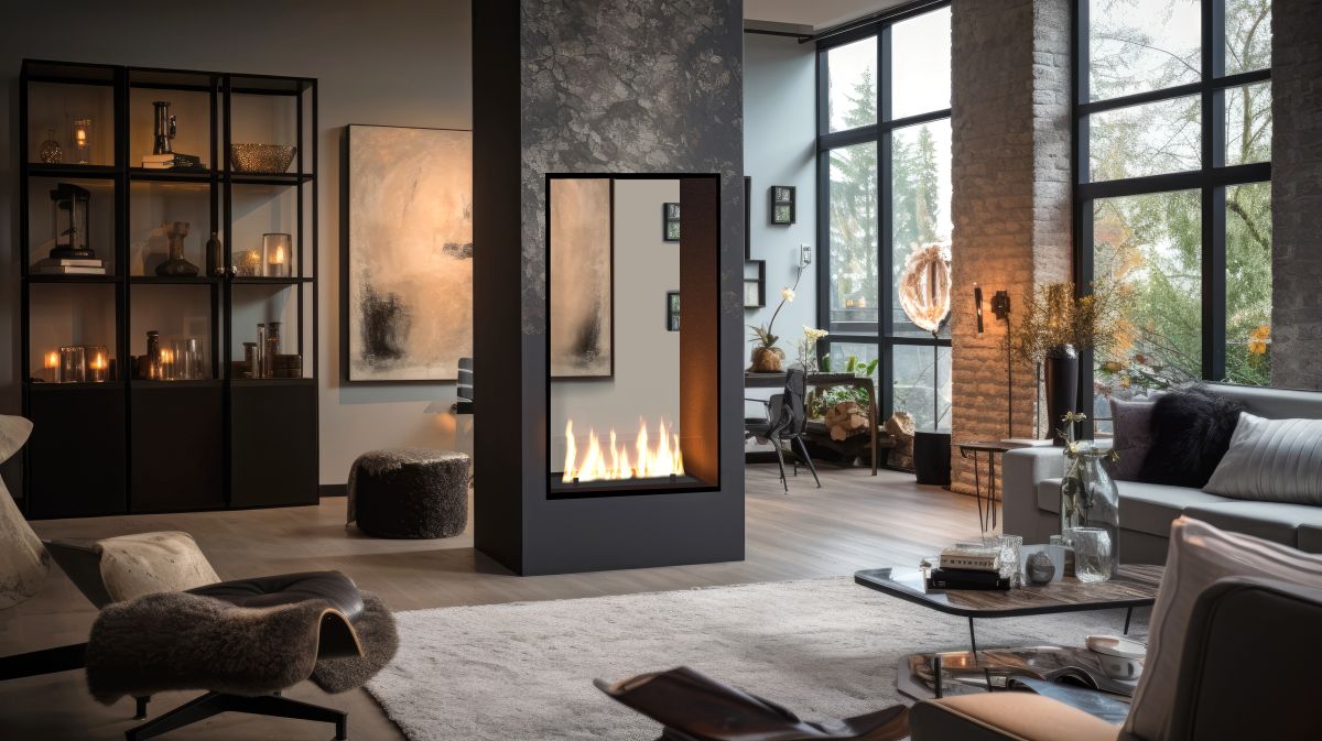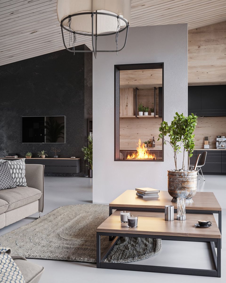 The double-sided design allows for functional use in two adjacent rooms, creating a cozy atmosphere while also providing a practical solution for dividing space, creating a modern interior element, adding personality to the entire interior.