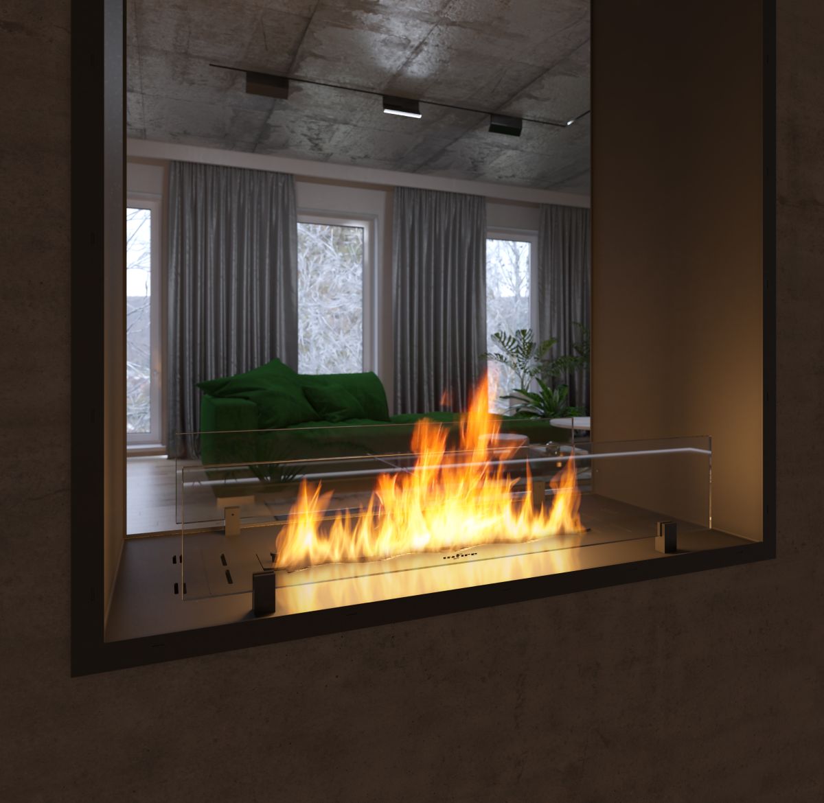 Infire's luxurious, double-sided built-in biofireplace is a striking, open on two sides biofireplace that is easy and safe to install in an existing structure. The Slim 2Side series' narrow structure, only 350 mm, and uniform, all-black color make it a modern and elegant biofireplace solution for every location. The slim frame structure completes the carefully finished look. Available in horizontal, 800 and 1200 mm wide versions and vertical 1000, 1400 and 1600 mm high versions.