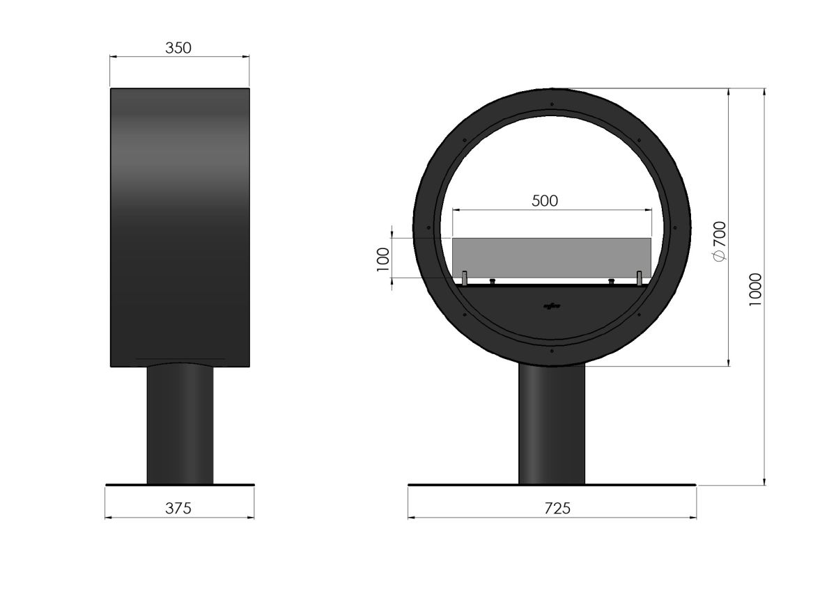 - Mitat: halkaisija 700 mm × syvyys 350 mm, kokonaiskorkeus 1000 mm, jalustaosa 725 x 375 x 3 mm