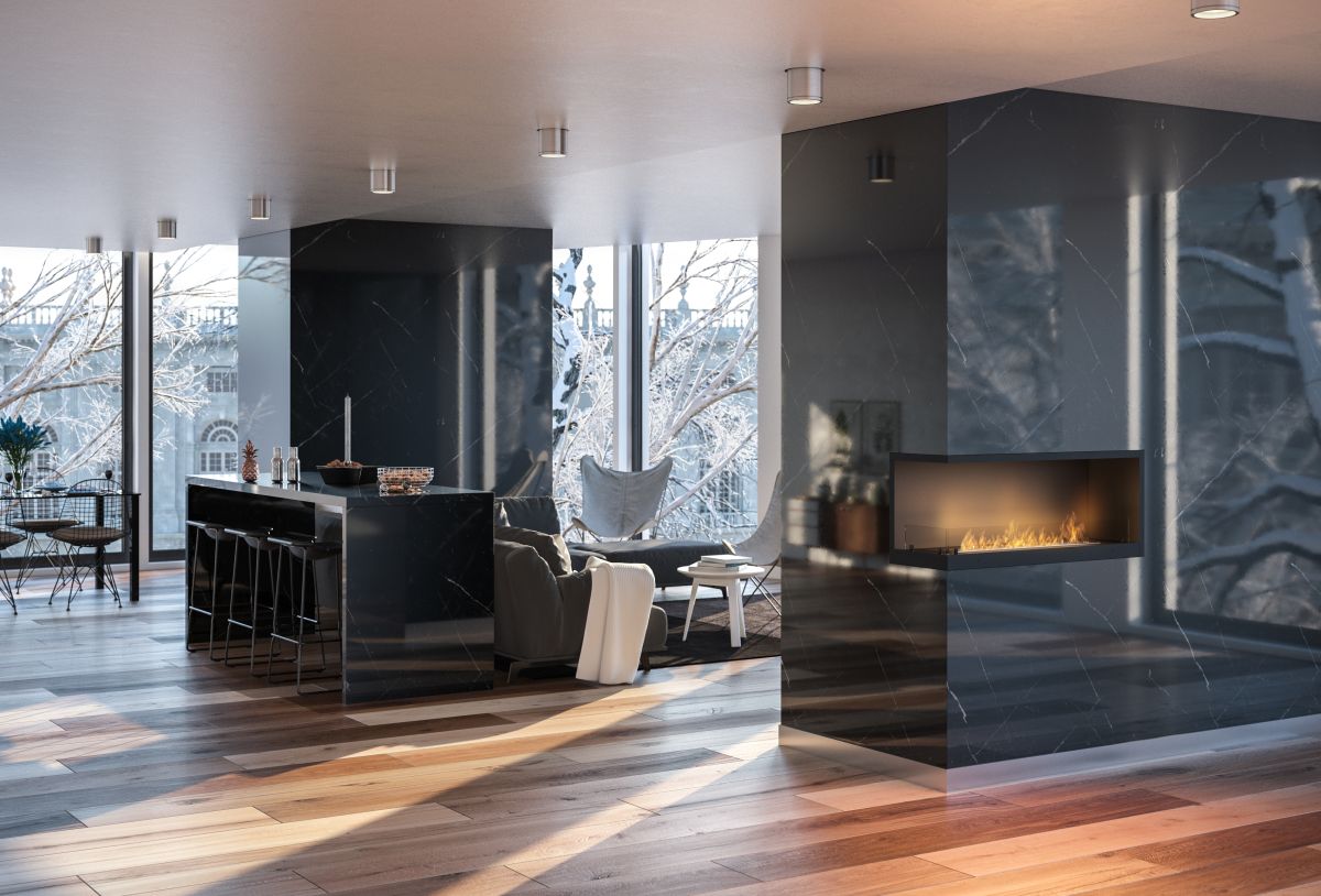 Suunniteltu upotettavaksi kulmaukseen. Moderni sisustuselementti, joka luo persoonallisen sisustuksen ja jonka elävä tuli näkyy kolmelta sivulta!